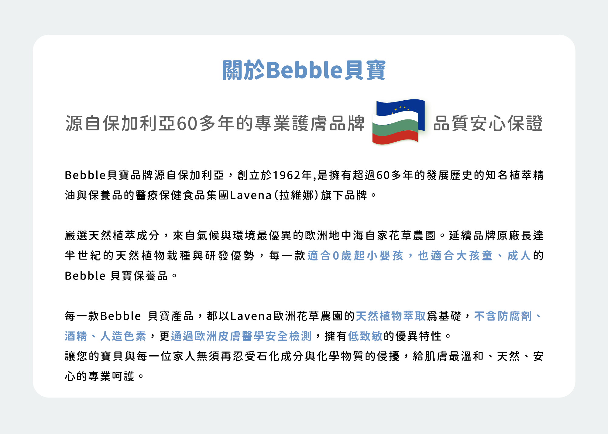 Bebble在歐洲是很多新手父母為寶寶選擇的肌膚保養品,安心配方無添加防腐劑、人工色素、酒精、香料等,由BB出生第一天就可以使用