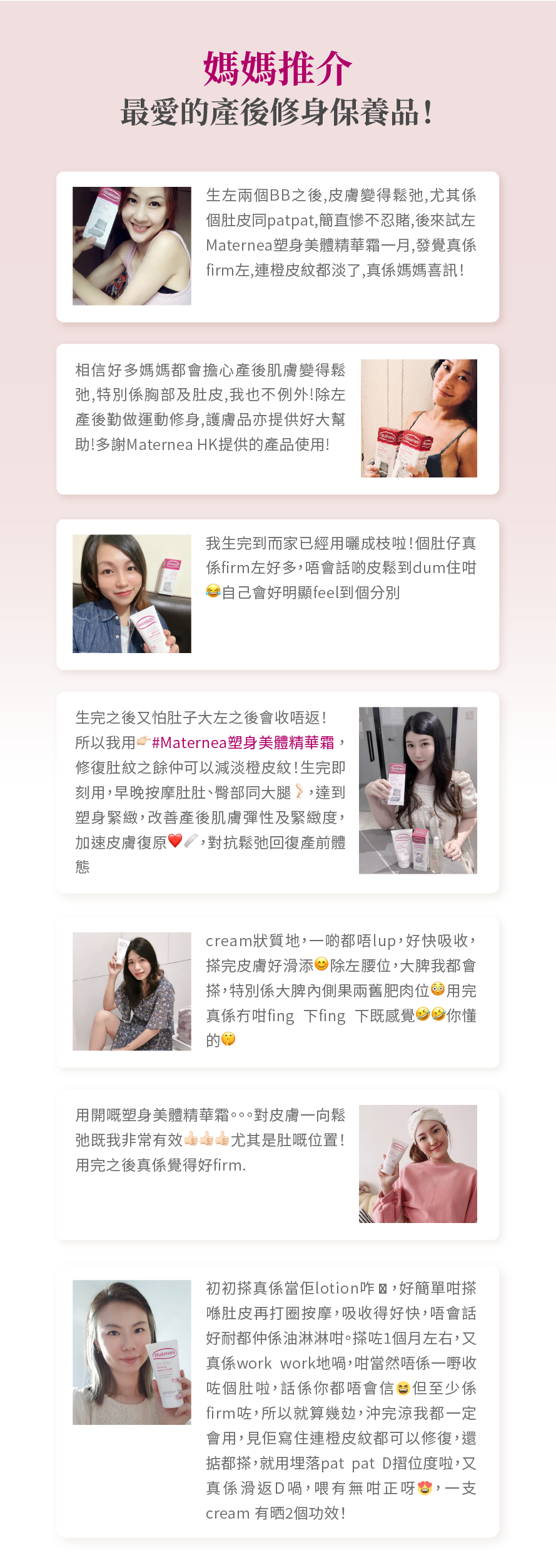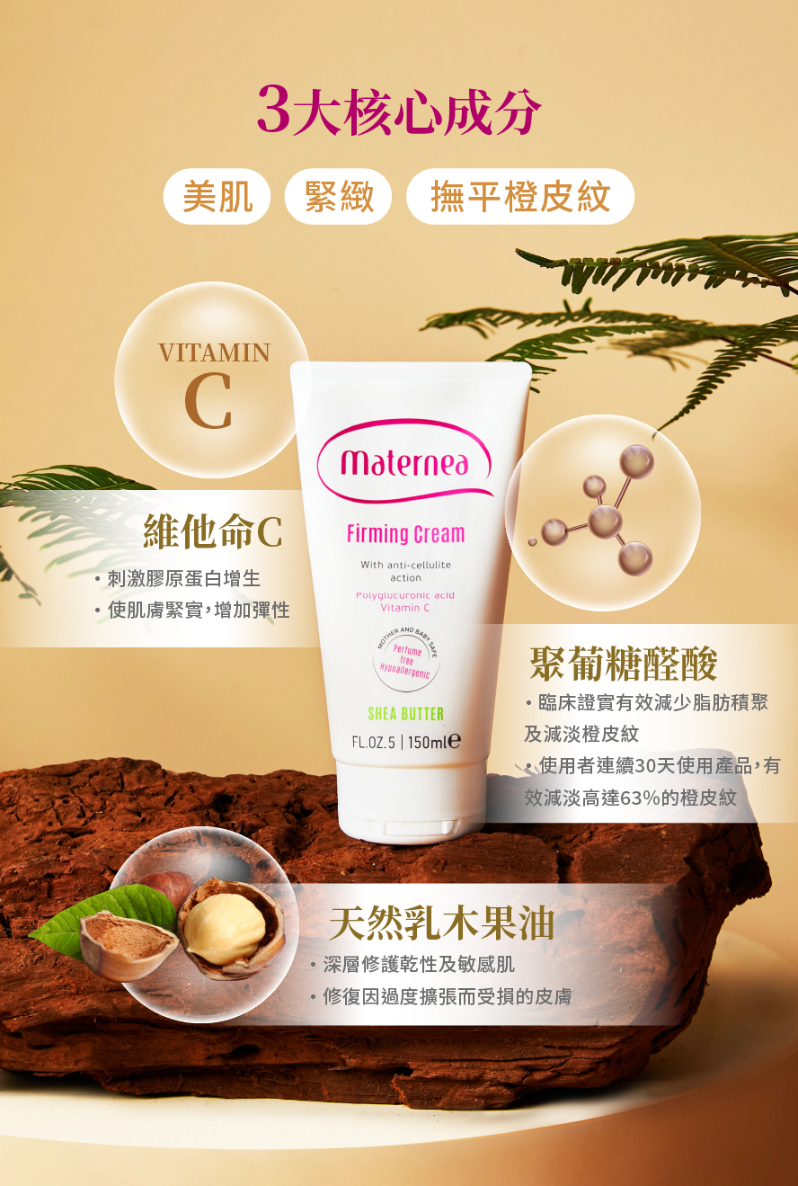 Has been clinically proven to have the effect of tightening the skin, which can smooth the skin tissue and make the skin structure healthier. At the same time, it can effectively eliminate excessive fat accumulated during pregnancy.