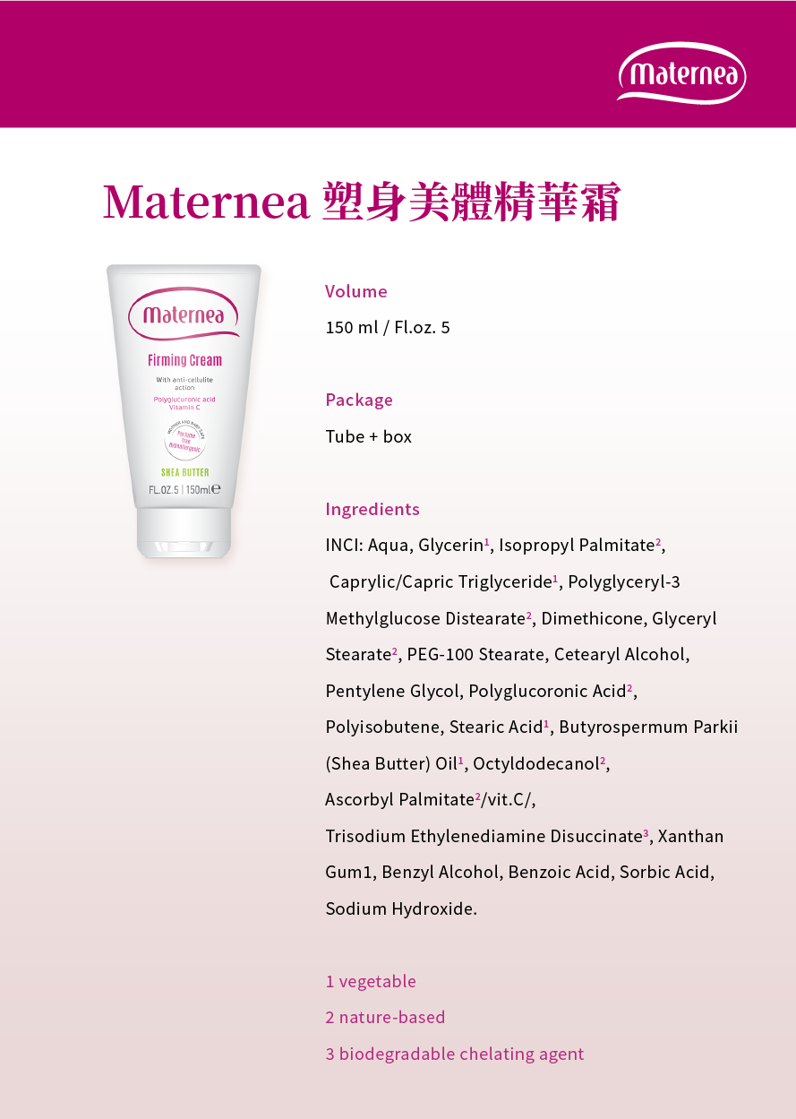 Has been clinically proven to have the effect of tightening the skin, which can smooth the skin tissue and make the skin structure healthier. At the same time, it can effectively eliminate excessive fat accumulated during pregnancy.