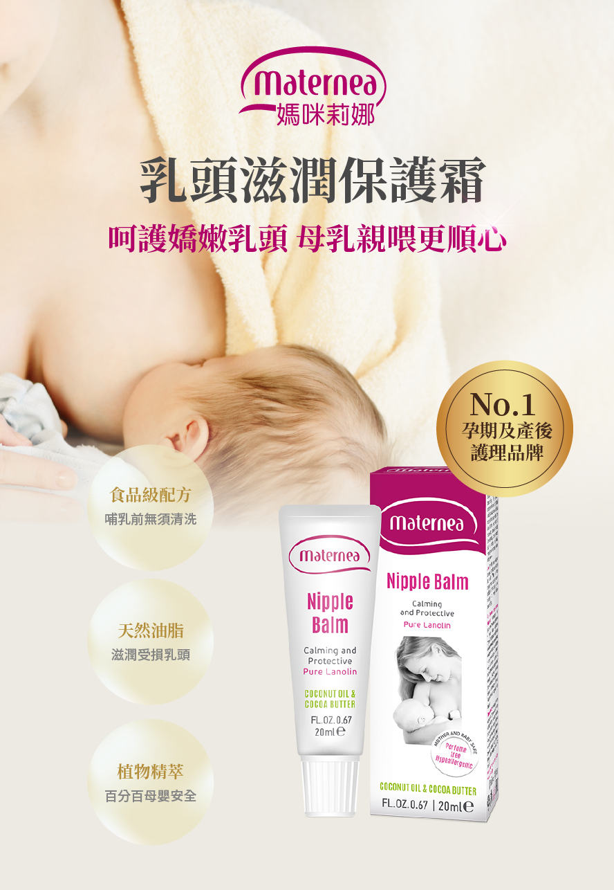 Maternea is quite supportive of breastfeeding, and can also experience that especially for mothers who try to breastfeed for the first time, it is easy to encounter some conditions, resulting in dry skin near the nipples and damage. Often unfamiliar with breastfeeding methods and postures, babies' saliva, bathing products used for bathing and cleaning, and even some close-fitting clothes will cause damage and cracking of nipples. "Maternea Nipple Balm" protects and repairs dryness, damage, redness and swelling caused by breastfeeding. Let you enjoy the most intimate contact with your baby. Food-grade ingredients are absolutely safe for babies; it is recommended to start using them before preparing for breastfeeding.
