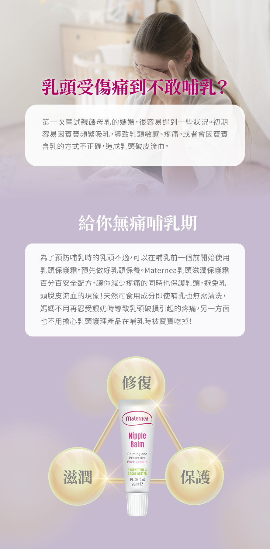 calms and anti-inflammatory, helps cell regeneration, and effectively eliminates the redness, swelling and pain of the nipple.