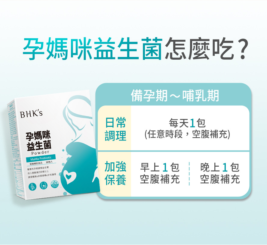 備孕期、孕初期每天1粒;孕中期~哺乳期每天2粒,於餐後搭配開水補充。