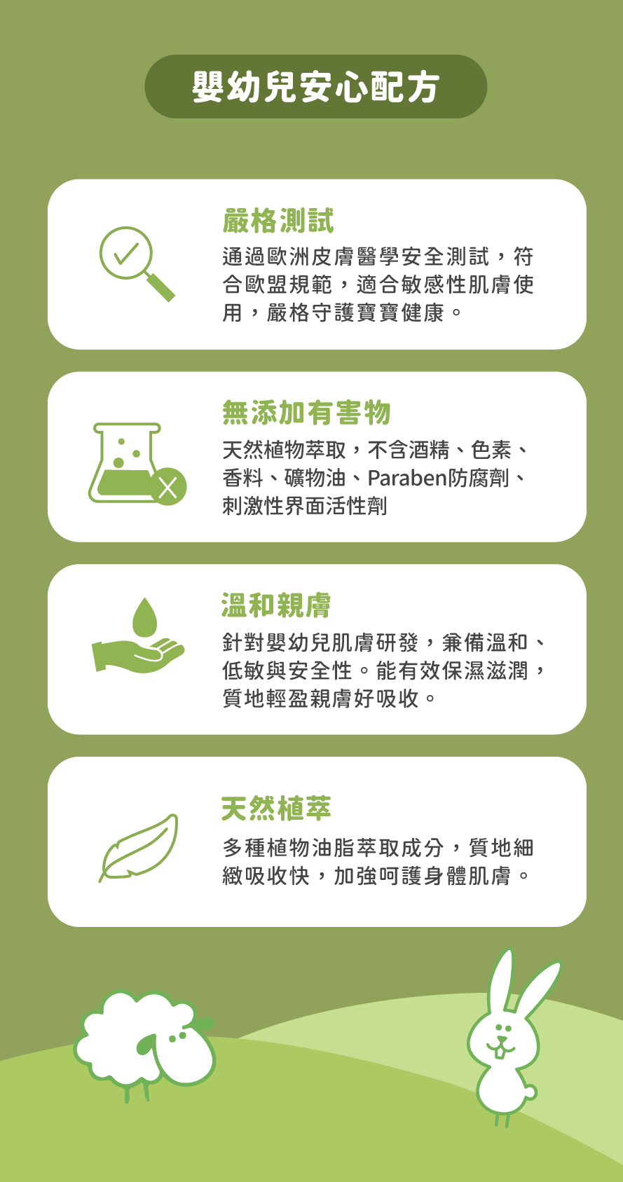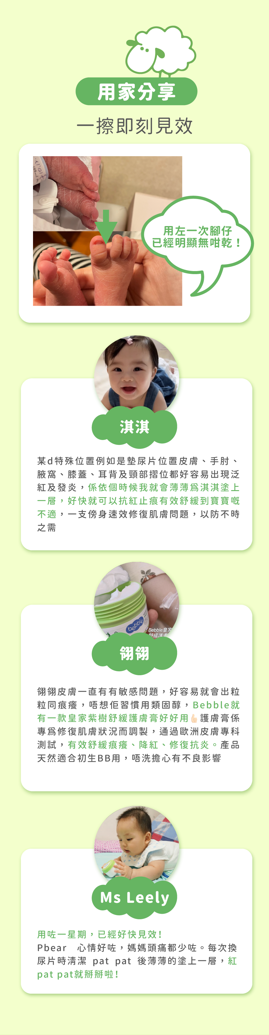 速效修復肌膚問題。尤其適合用於較容易泛紅及發炎的特殊部位,例如是墊尿片位置皮膚、手肘、腋窩、膝蓋、耳背及頸部摺位。