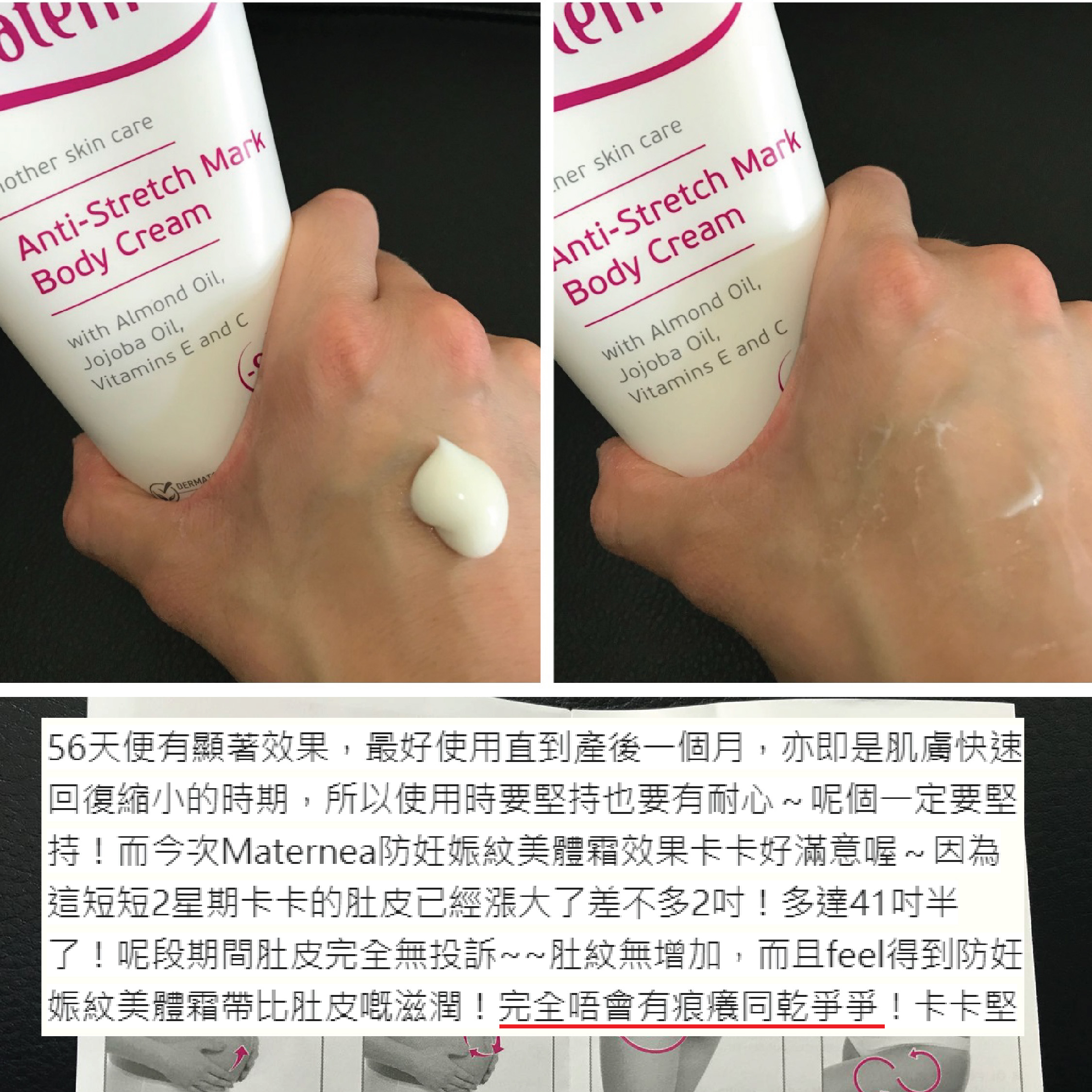 最喜歡Maternea anti-stretch body cream 它質地好推不黏膩,可以很快擦好肚皮四周,手臂,大腿,及pat pat,無香配方對香味敏感或孕期皮膚敏感的媽媽完全就是加分。」