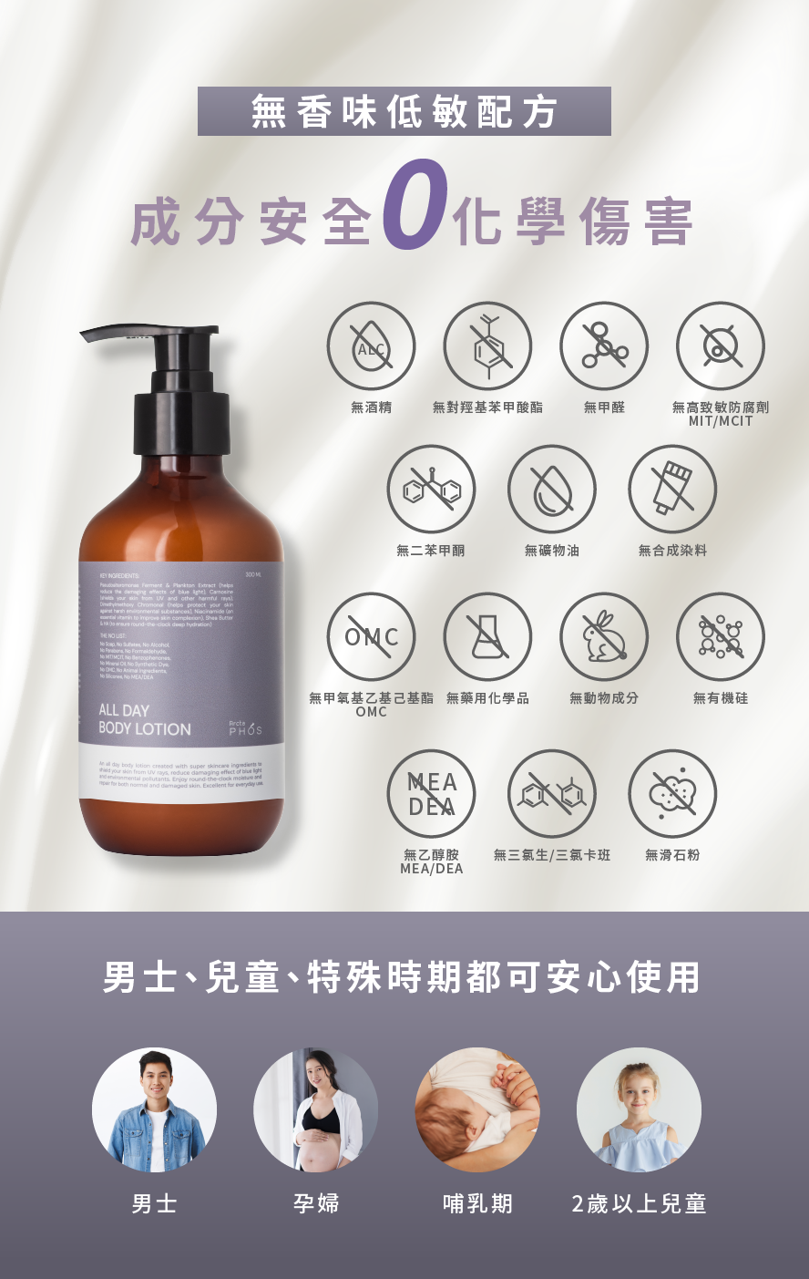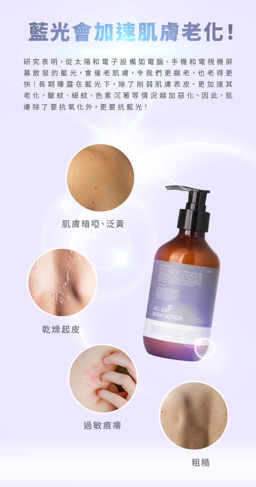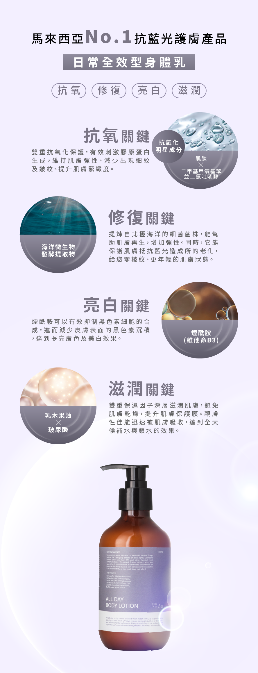 當下必備的身體護膚乳。這款全方位身體防護乳,採用超級護膚成分製成,可保護您的皮膚減少紫外線、紅外線、HEV(藍光)、電磁波和環境污染物的侵害。 為正常和受損肌膚,提供全天候的滋潤和修護。非常適合日常使用。