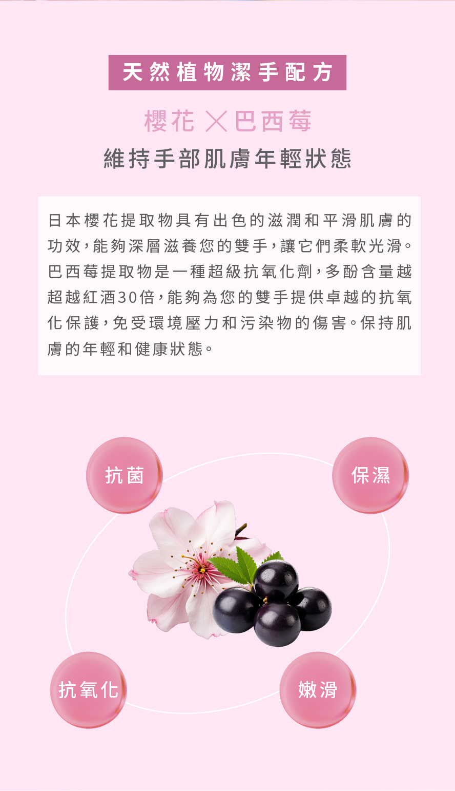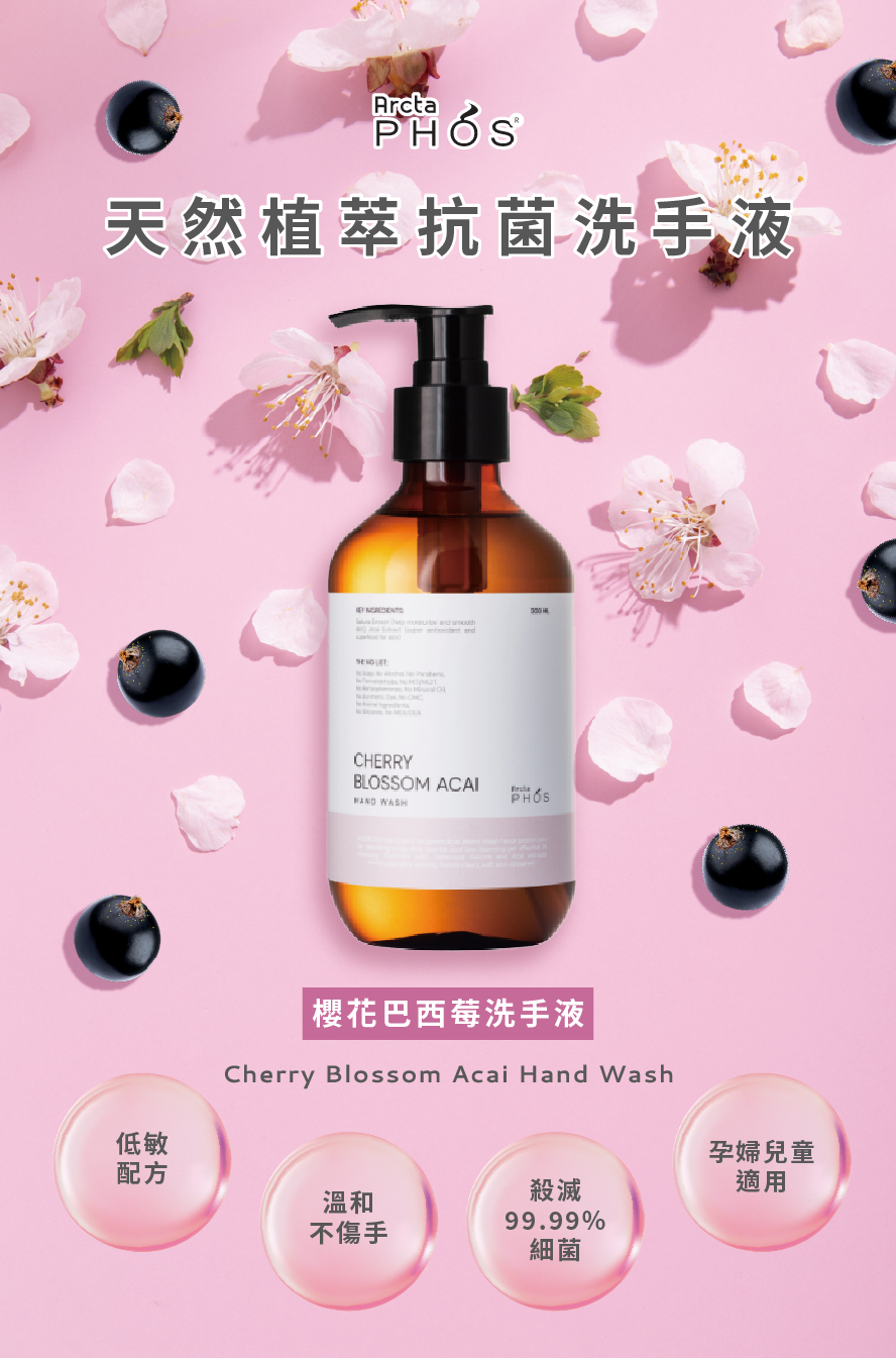 櫻花巴西莓洗手液通過消毒殺菌來保護您的雙手。溫和及低泡沫配方,具明顯清潔效果;富含日本櫻花和巴西莓,有助於保濕、滋潤和抗氧化,令雙手肌膚潔淨柔嫩和清新。