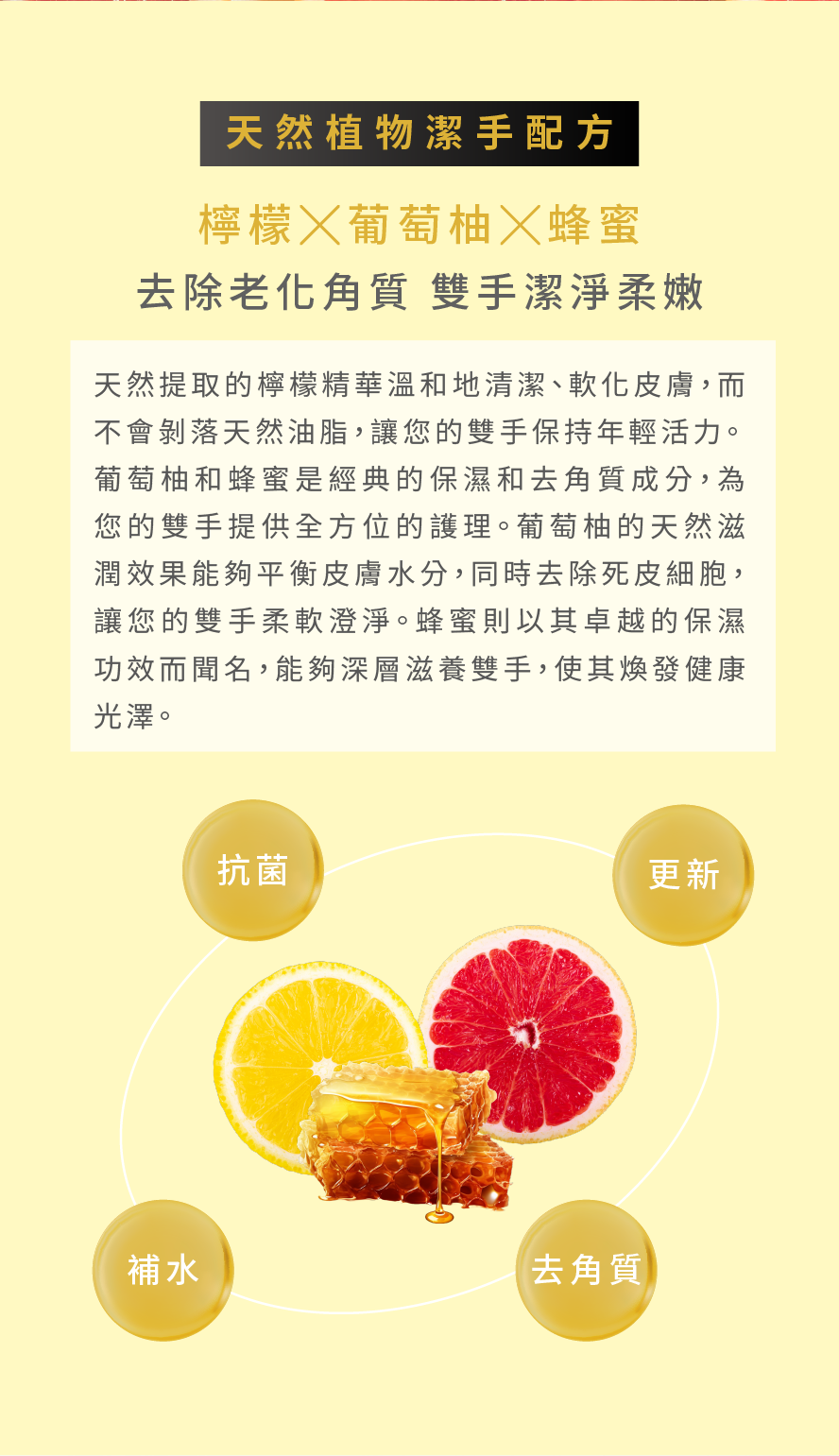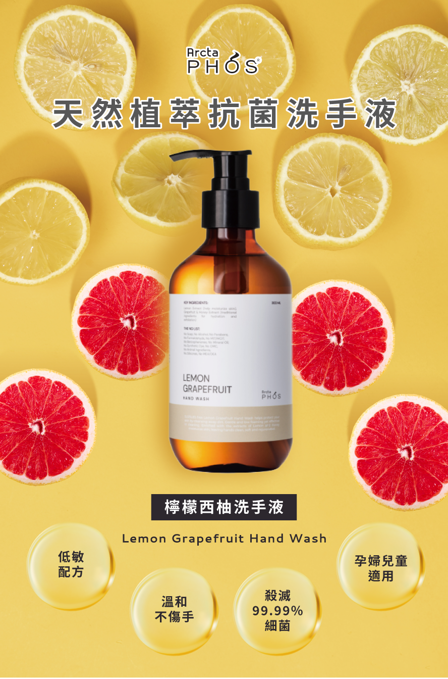 檸檬葡萄柚洗手液通過消毒殺菌來保護您的雙手。溫和及低泡沫配方,更具明顯的清潔效果;富含檸檬和蜂蜜,有助於保濕和煥活,令雙手肌膚潔淨柔嫩。