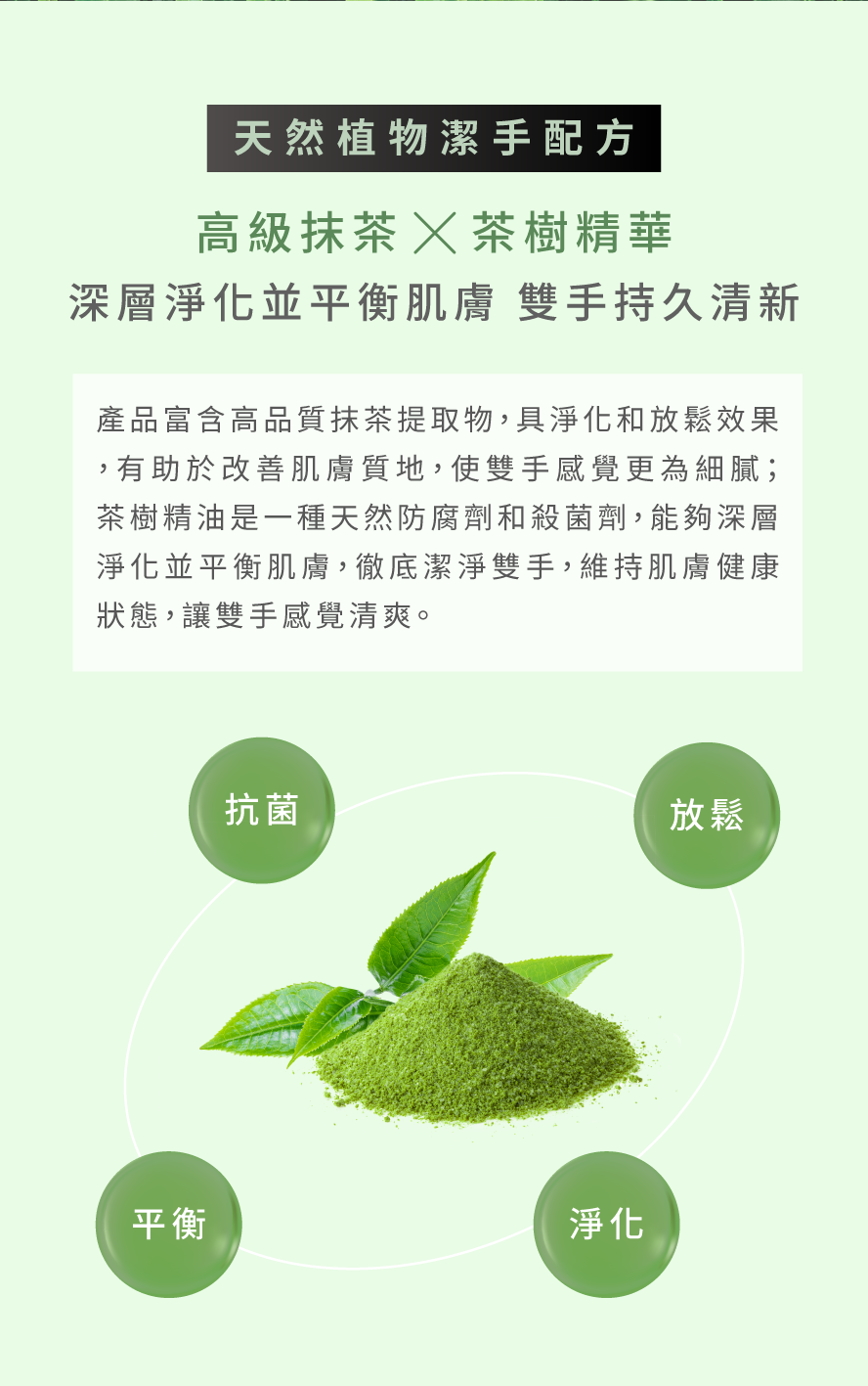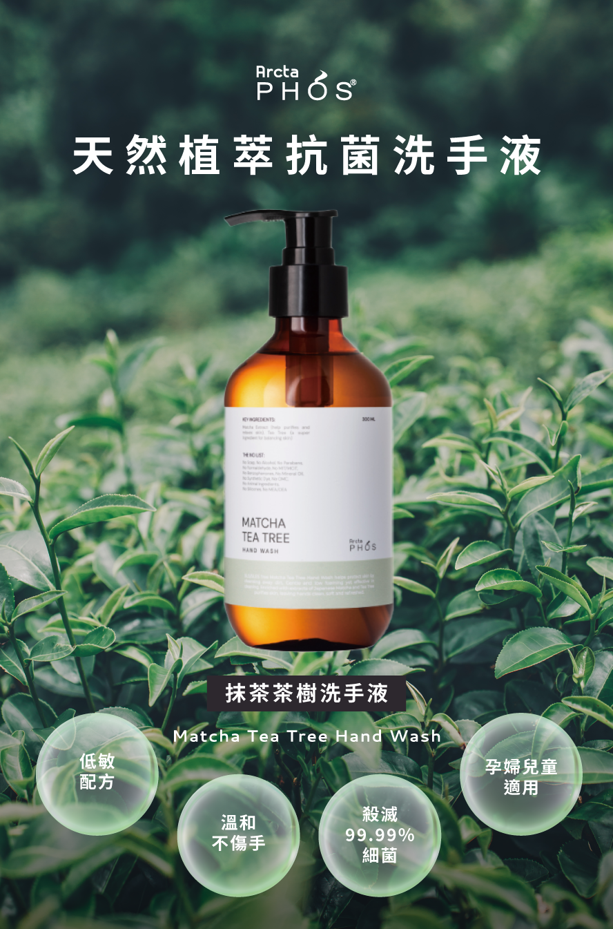 抹茶茶樹洗手液 通過消毒殺菌來保護您的雙手。溫和及低泡沫配方,更具明顯的清潔效果;富含日本抹茶和醫藥級茶樹精油,有助於淨化、均衡和平滑,令雙手肌膚潔淨柔嫩和清新。