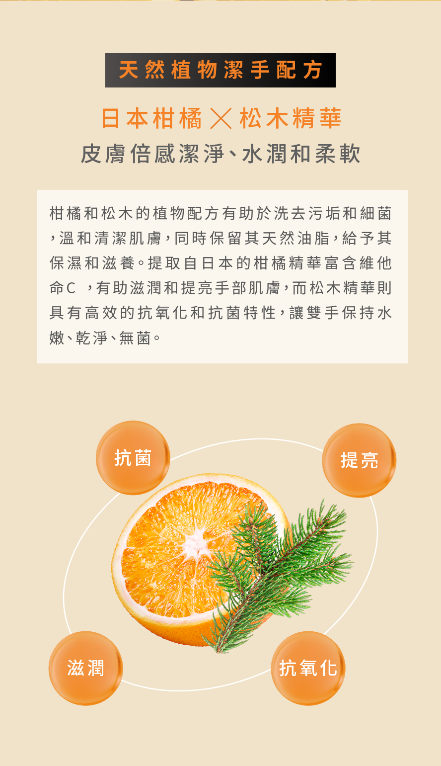 松木柑橘洗手液通過消毒殺菌來保護您的雙手。溫和及低泡沫配方,更具明顯的清潔效果;富含松木和日本蜜柑,有助於保濕提亮和抗氧化,令雙手肌膚潔淨柔嫩。