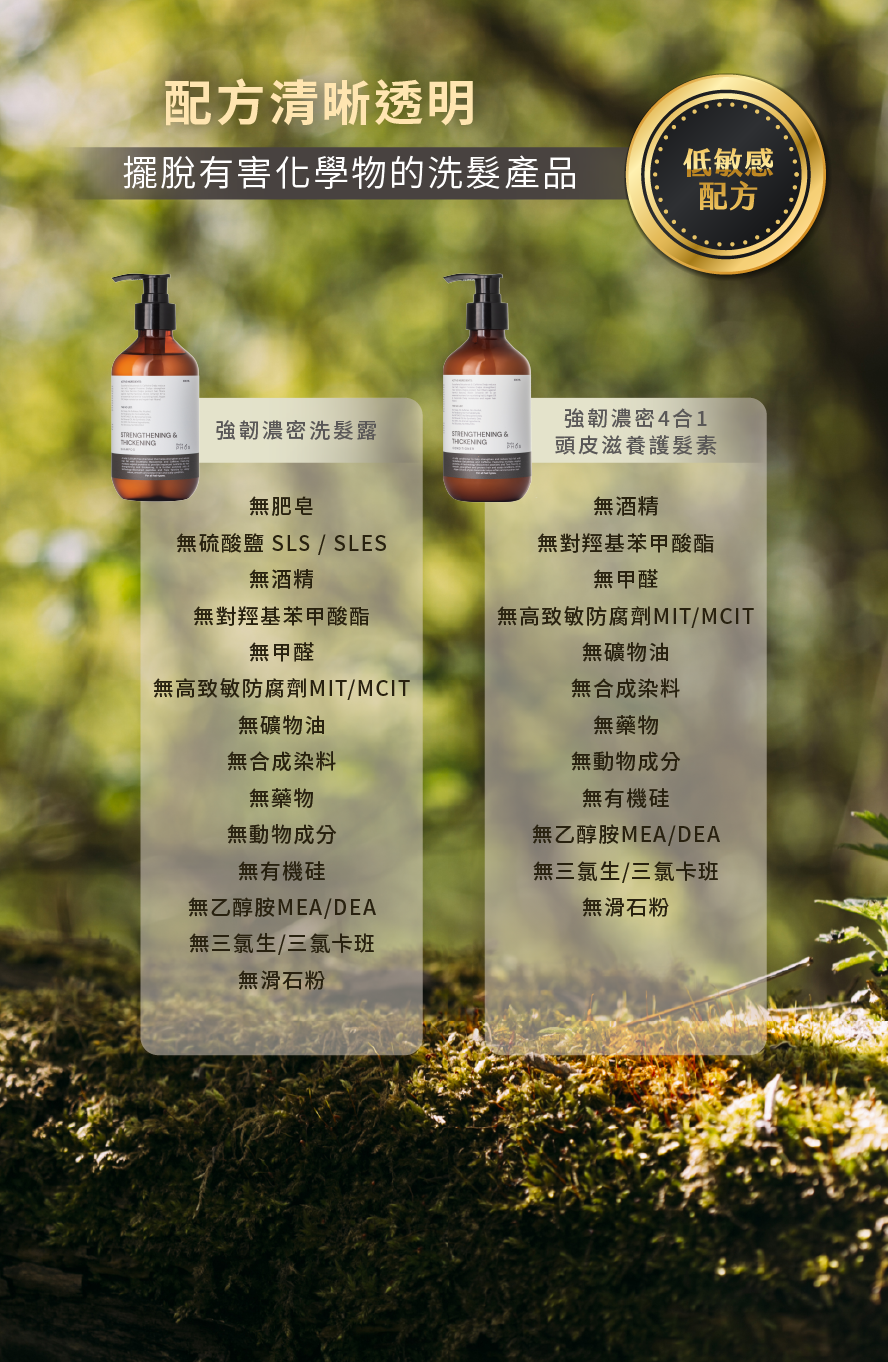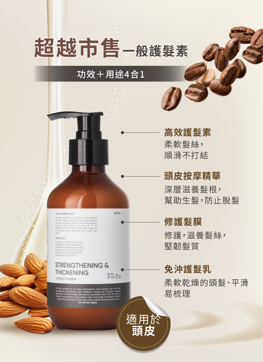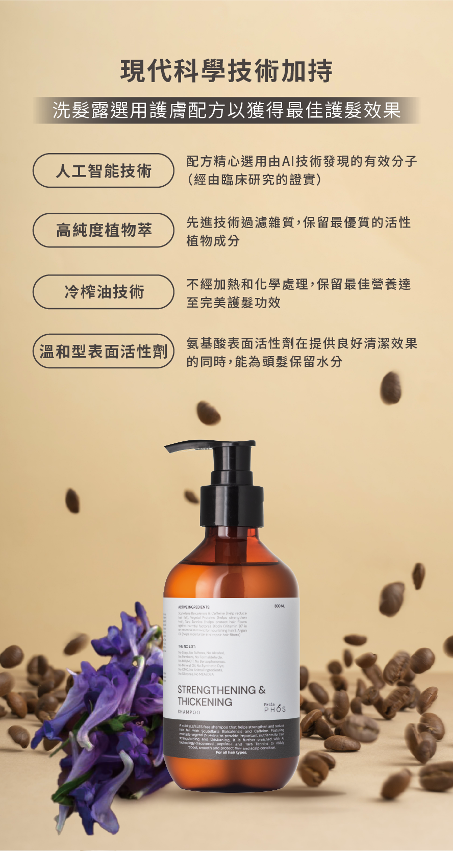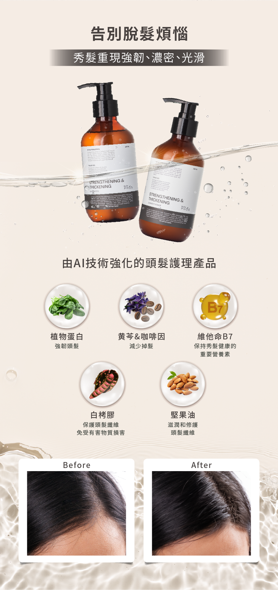 一款溫和的洗髮水,含有黃芩和咖啡因,有助於強韌和減少脫髮。它含有多種植物蛋白,可為頭髮強韌和增厚提供重要營養,進一步富含人工智能技術發現的肽和白栲膠, 可顯著強韌、撫平和保護頭髮和頭皮狀況。
