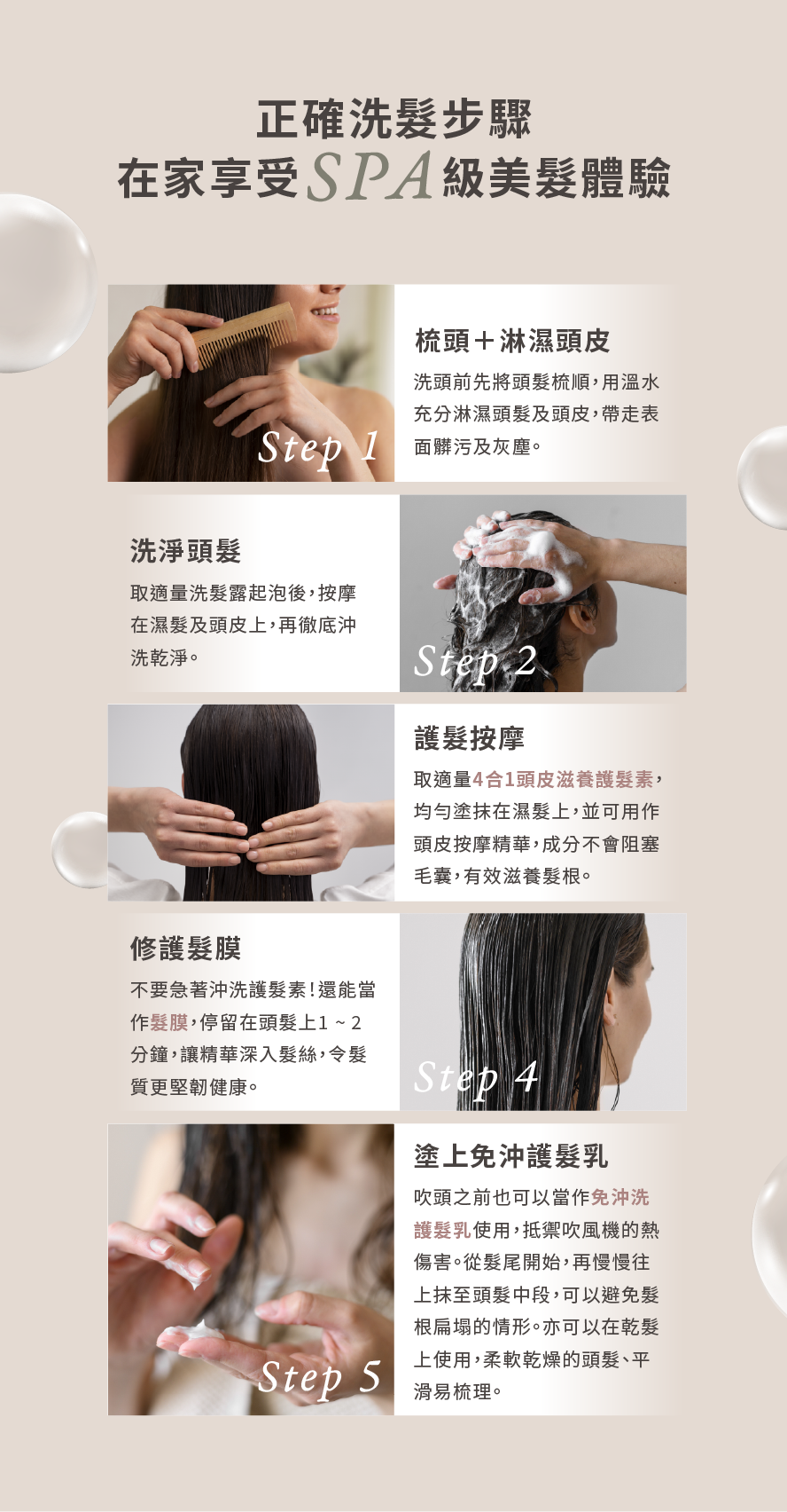 • 免沖護髮乳: 乾髮時使用,柔軟髮絲,順滑不打結